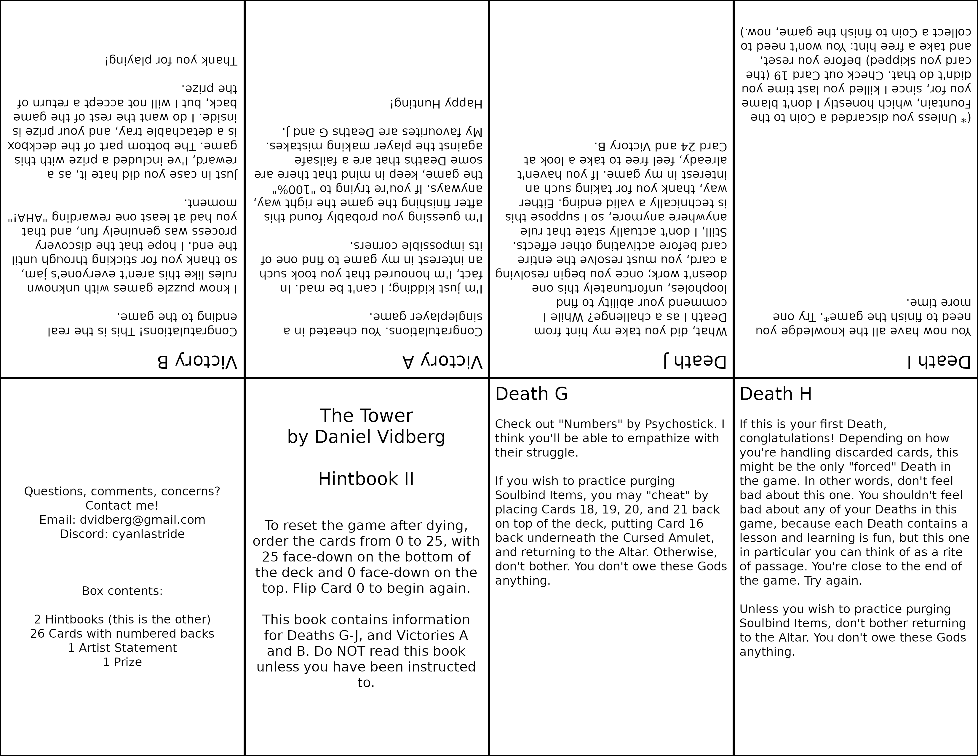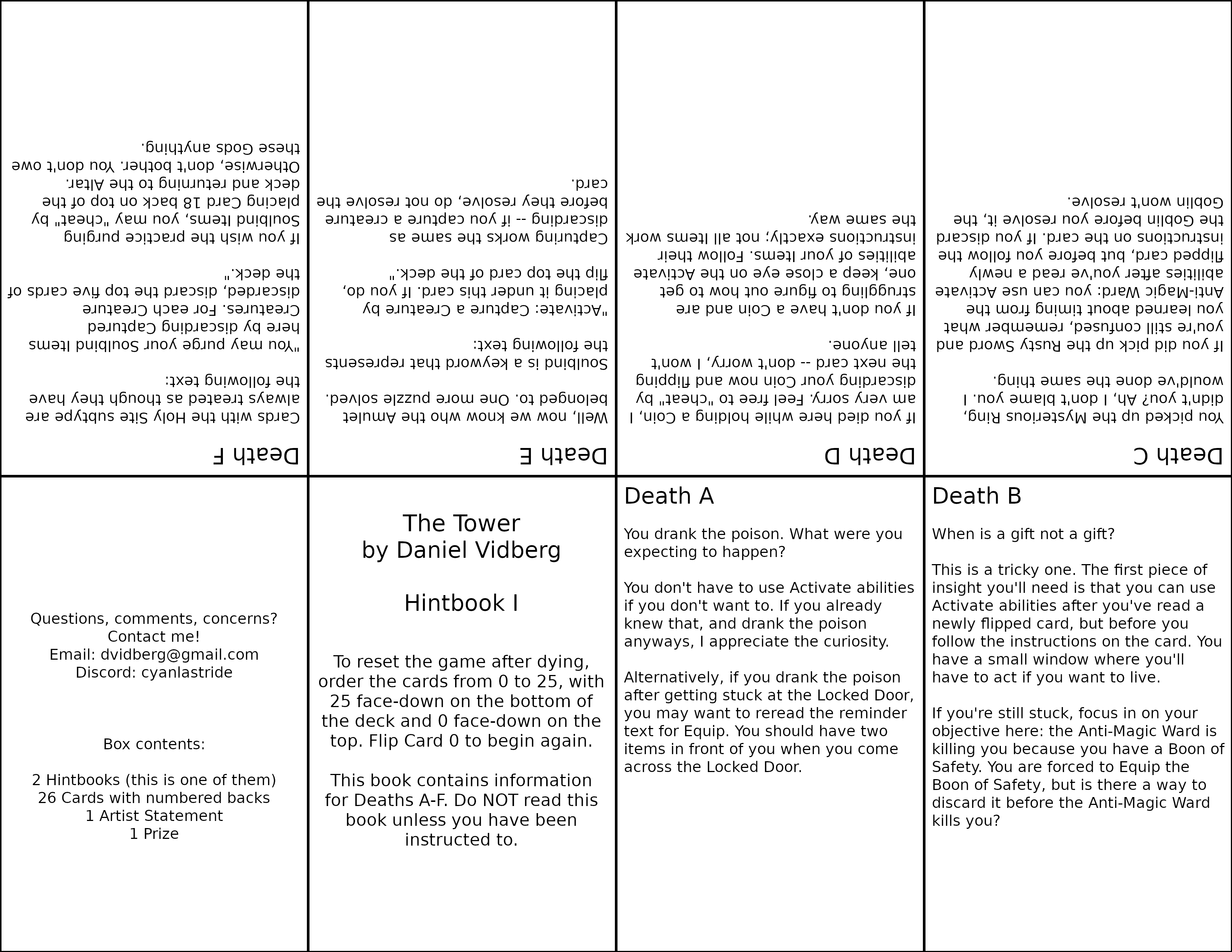 At certain points, the game will ask you to refer to a Death or a Victory, such as on Card 4, Vial of Poison, which asks you to refer to Death A. To do this, you may either print and cut out the hintbooks linked below, or refer back to this page which has each Death and Victory linked at the bottom.